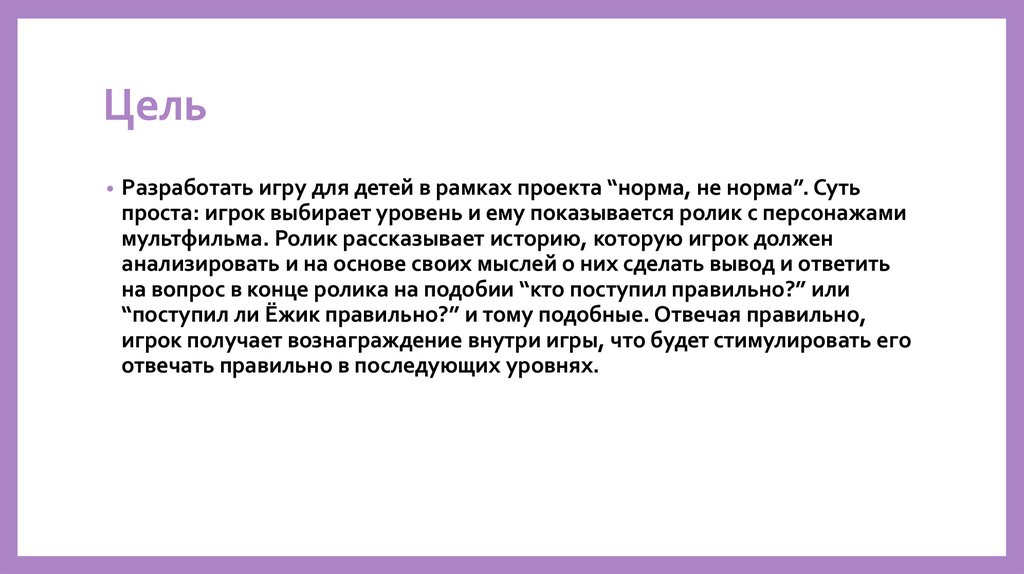 Цель• Разработать игру для детей в рамках проекта “норма, не норма”. Суть