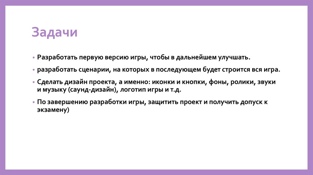 Задачи• Разработать первую версию игры, чтобы в дальнейшем улучшать.