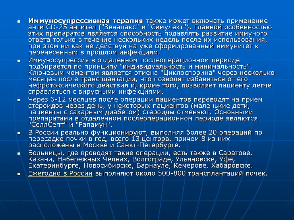 Иммуносупрессивная терапия также может включать применениеанти CD-25 антител ("Зенапакс" и "Симулект"). Главной особенностью
