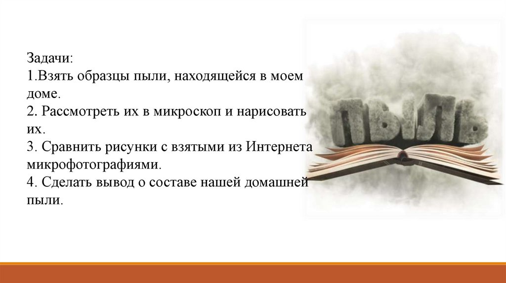 Задачи:1.Взять образцы пыли, находящейся в моем