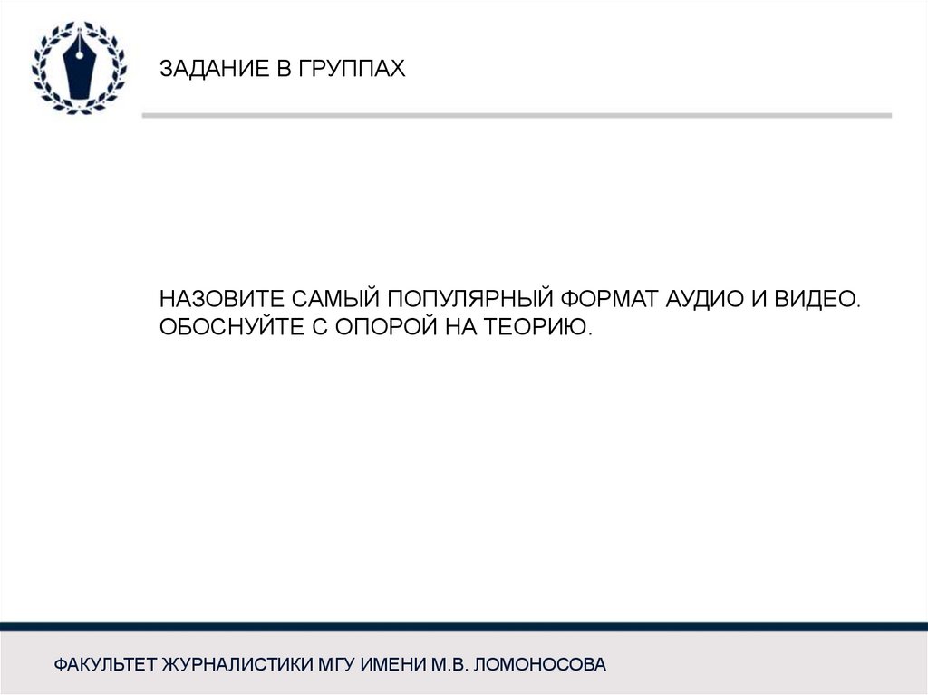 ЗАДАНИЕ В ГРУППАХНАЗОВИТЕ САМЫЙ ПОПУЛЯРНЫЙ ФОРМАТ АУДИО И ВИДЕО.