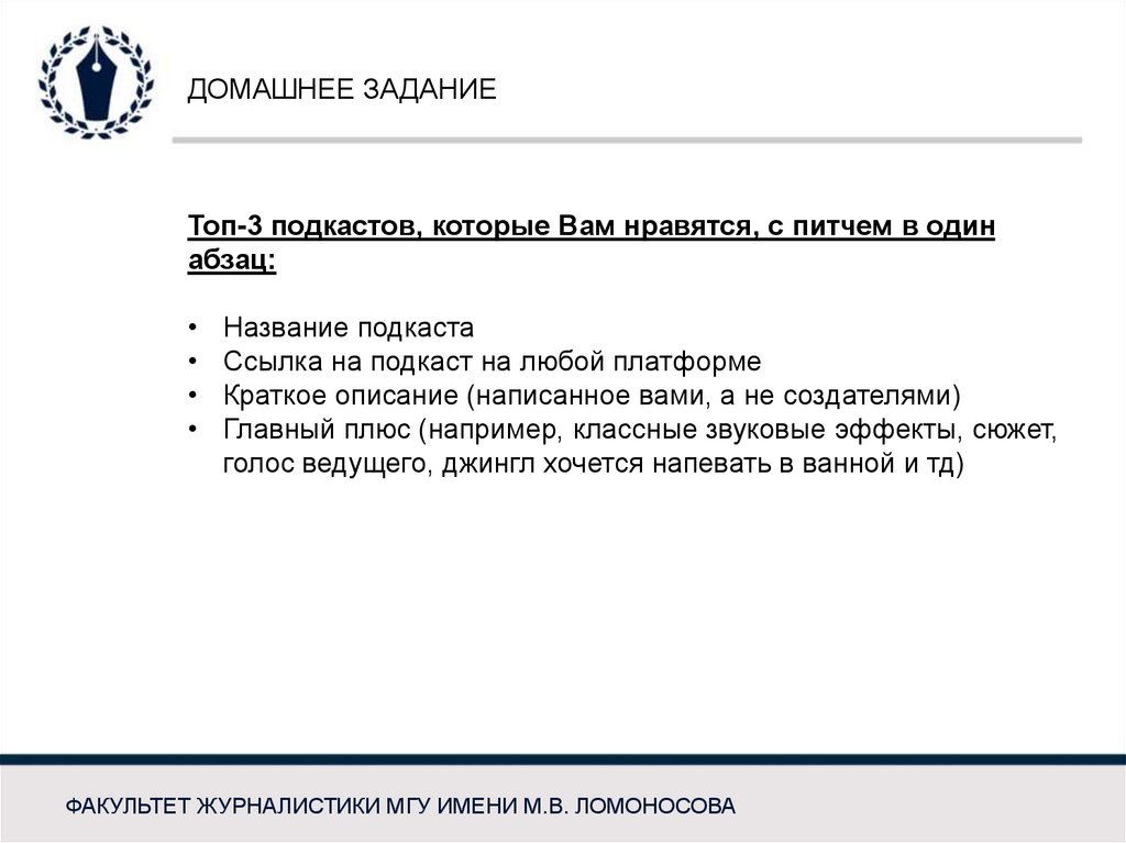 ДОМАШНЕЕ ЗАДАНИЕТоп-3 подкастов, которые Вам нравятся, с питчем в один