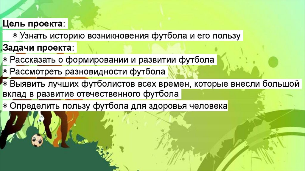 Цель проекта:◉ Узнать историю возникновения футбола и его пользу