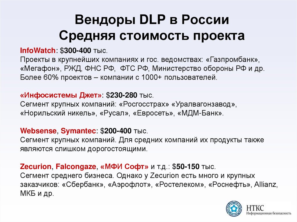 Вендоры DLP в РоссииСредняя стоимость проекта