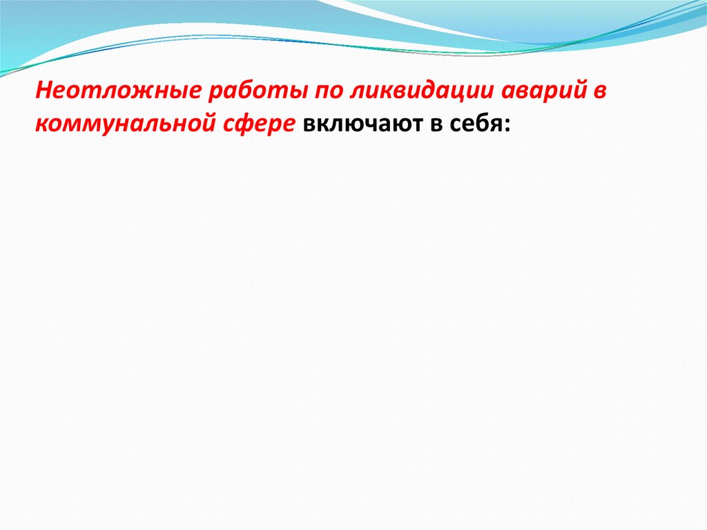 Неотложные работы по ликвидации аварий вкоммунальной сфере включают в себя: