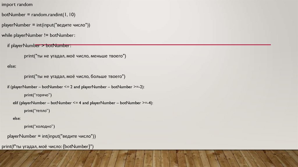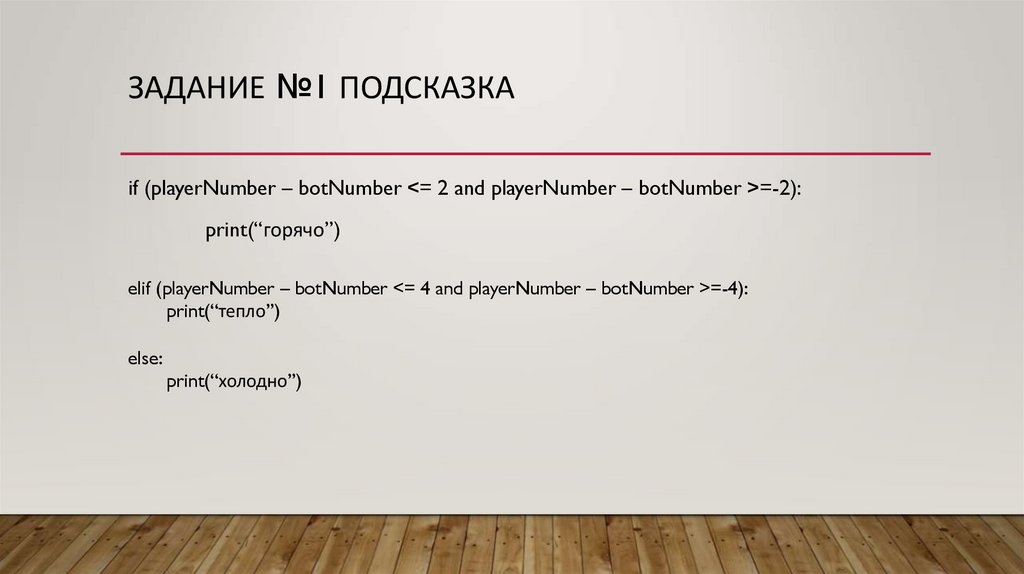 ЗАДАНИЕ №1 ПОДСКАЗКАif (playerNumber – botNumber <= 2 and playerNumber – botNumber >=-2):