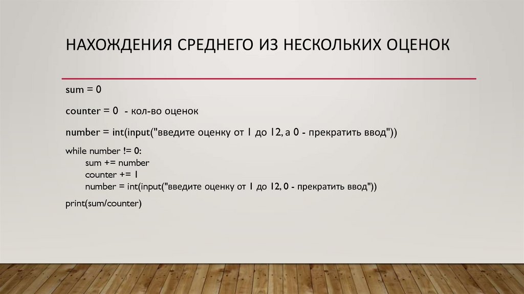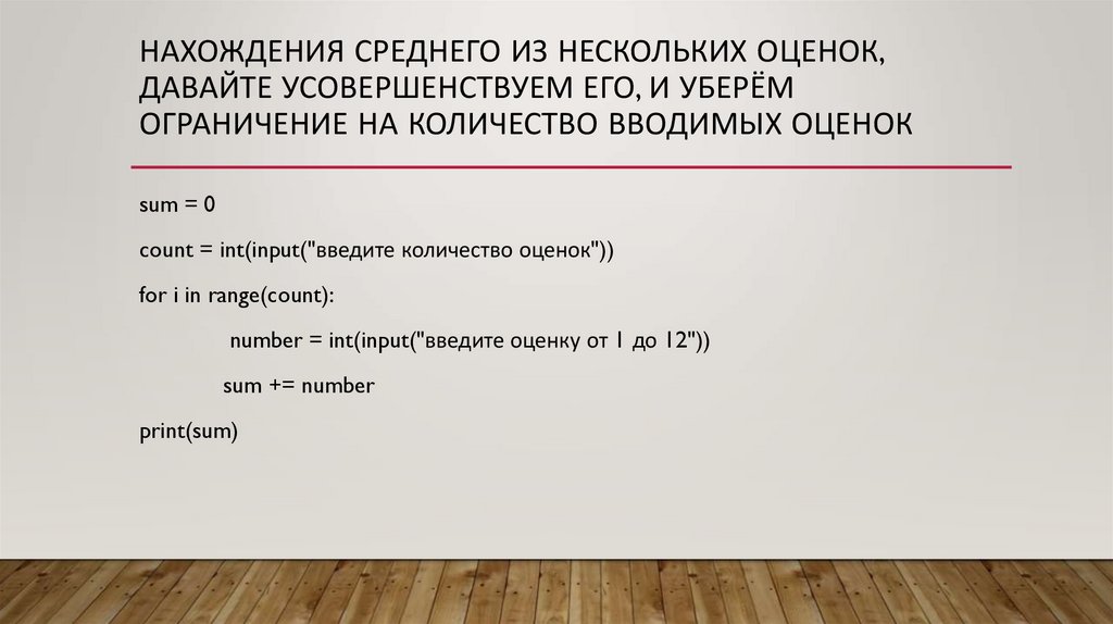 12. нахождения среднего из нескольких оценок, давайте усовершенствуем его, и уберём ограничение на количество вводимых оценок
