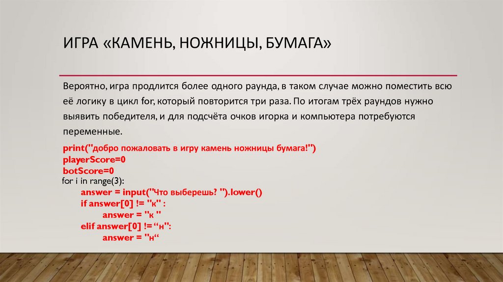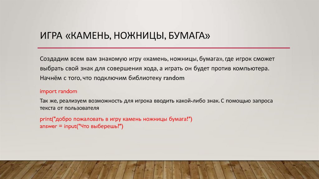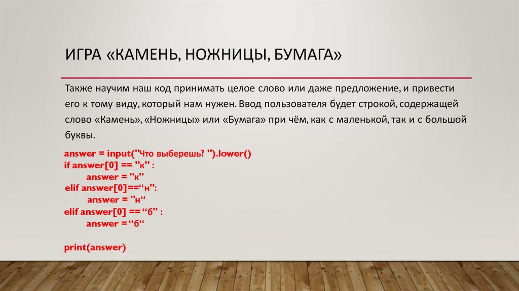ИГРА «КАМЕНЬ, НОЖНИЦЫ, БУМАГА»Также научим наш код принимать целое слово или даже предложение, и привести