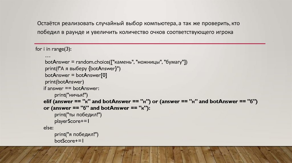 Остаётся реализовать случайный выбор компьютера, а так же проверить, ктопобедил в раунде и увеличить количество очков соответствующего игрока