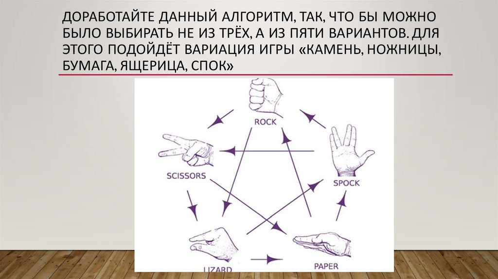 20. Доработайте данный алгоритм, так, что бы можно было выбирать не из трёх, а из пяти вариантов. Для этого подойдёт вариация игры