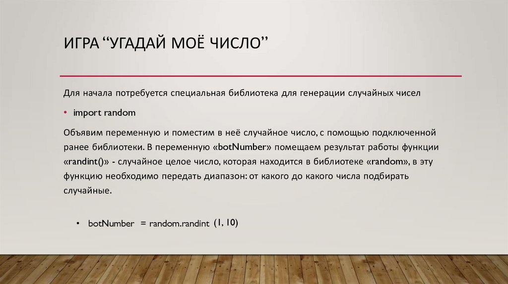 ИГРА “УГАДАЙ МОЁ ЧИСЛО”Для начала потребуется специальная библиотека для генерации случайных чисел