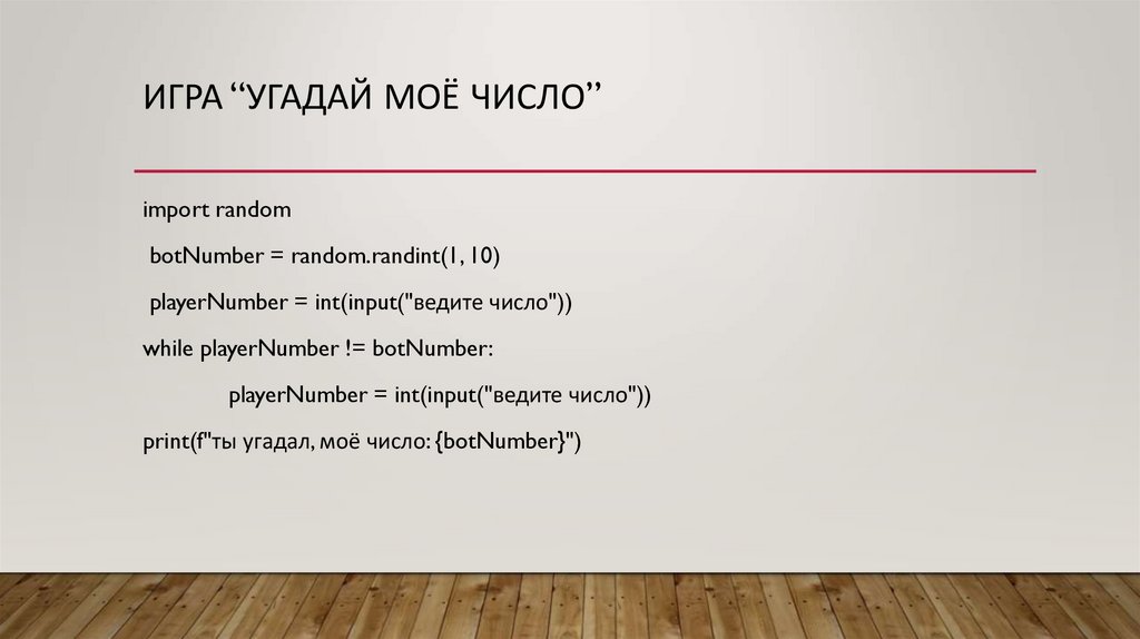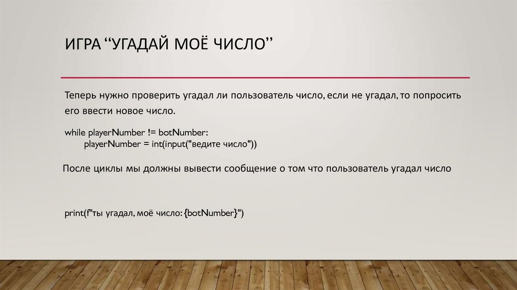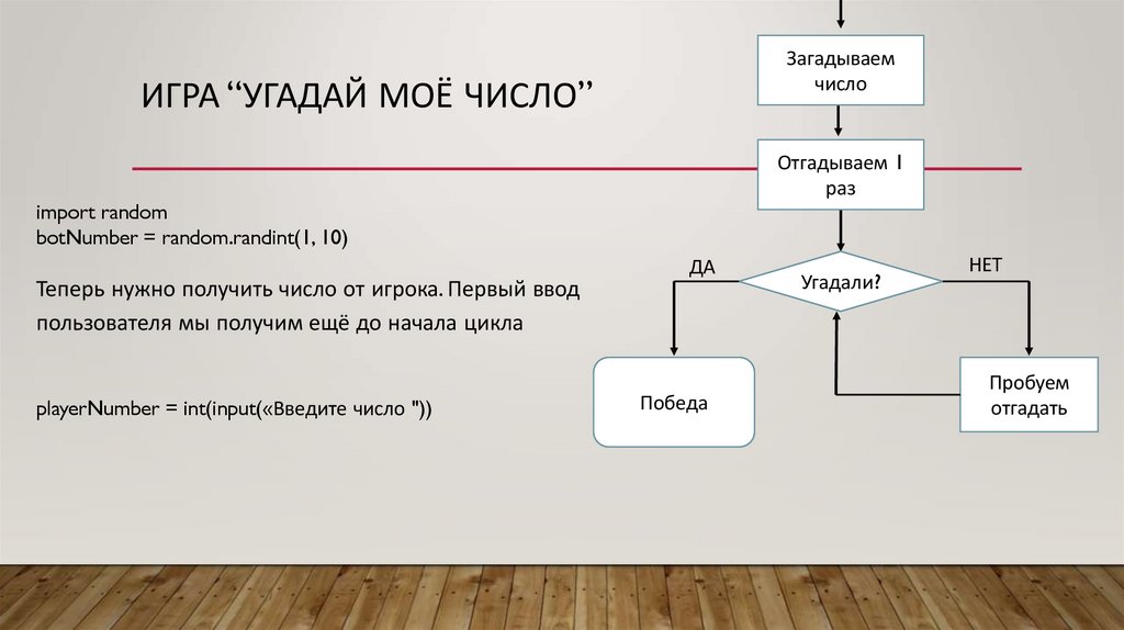 ИГРА “УГАДАЙ МОЁ ЧИСЛО”Теперь нужно проверить угадал ли пользователь число, если не угадал, то попросить