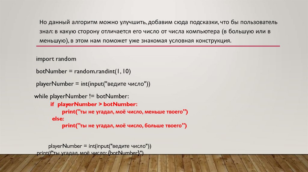 Но данный алгоритм можно улучшить, добавим сюда подсказки, что бы пользовательзнал: в какую сторону отличается его число от числа компьютера (в большую или в