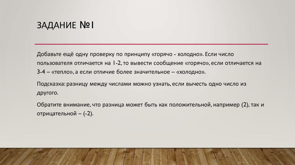 ЗАДАНИЕ №1Добавьте ещё одну проверку по принципу «горячо - холодно». Если число