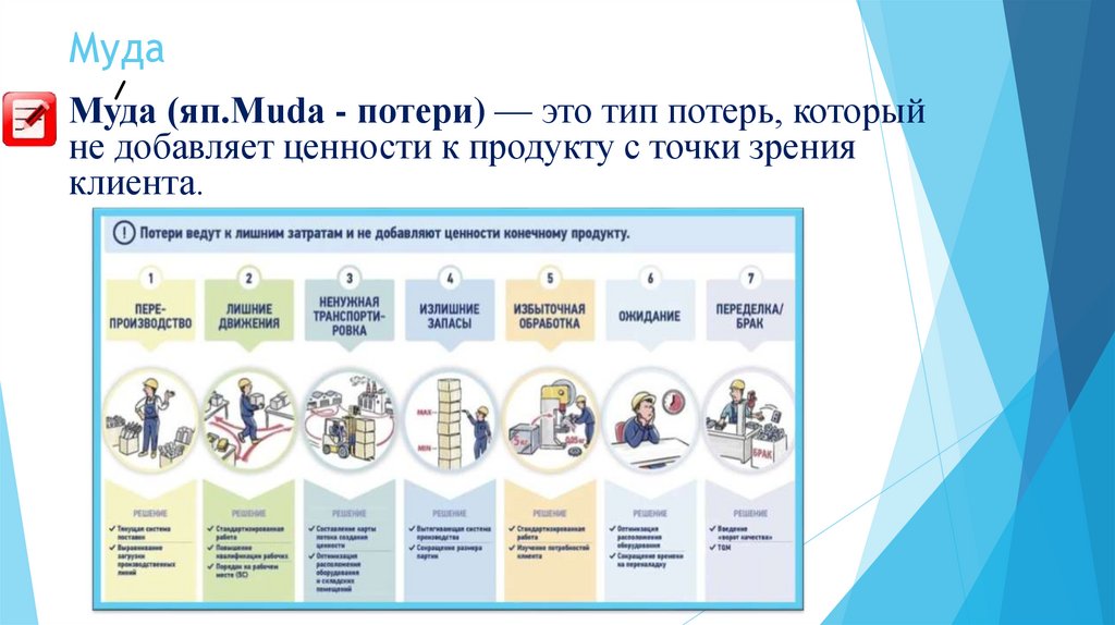 МудаМуда (яп.Muda - потери) — это тип потерь, который