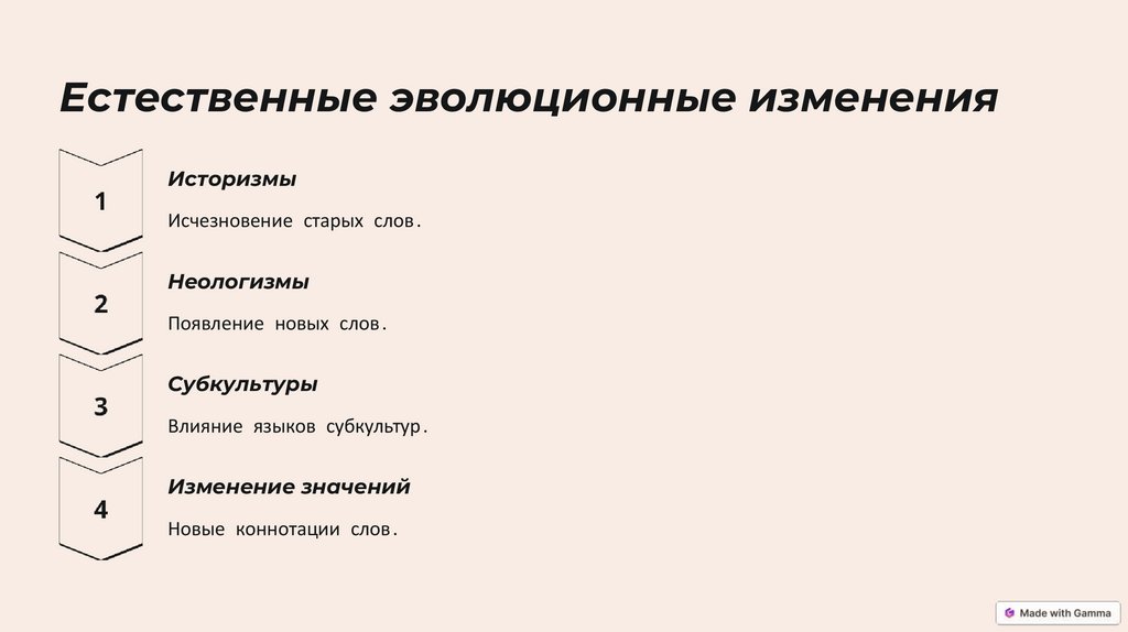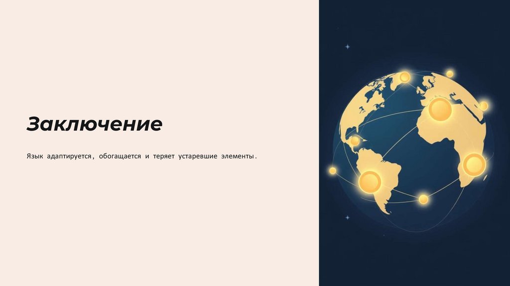 ЗаключениеЯзык адаптируется, обогащается и теряет устаревшие элементы.