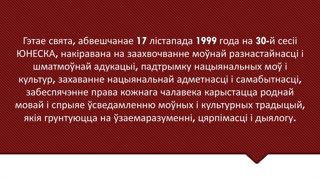 Гэтае свята, абвешчанае 17 лістапада 1999 года на 30-й сесііЮНЕСКА, накіравана на заахвочванне моўнай разнастайнасці і
