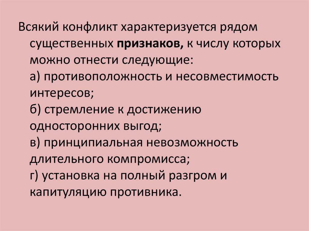 Всякий конфликт характеризуется рядомсущественных признаков, к числу которых