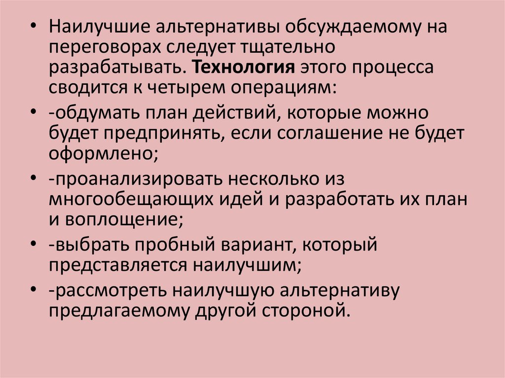 • Наилучшие альтернативы обсуждаемому напереговорах следует тщательно