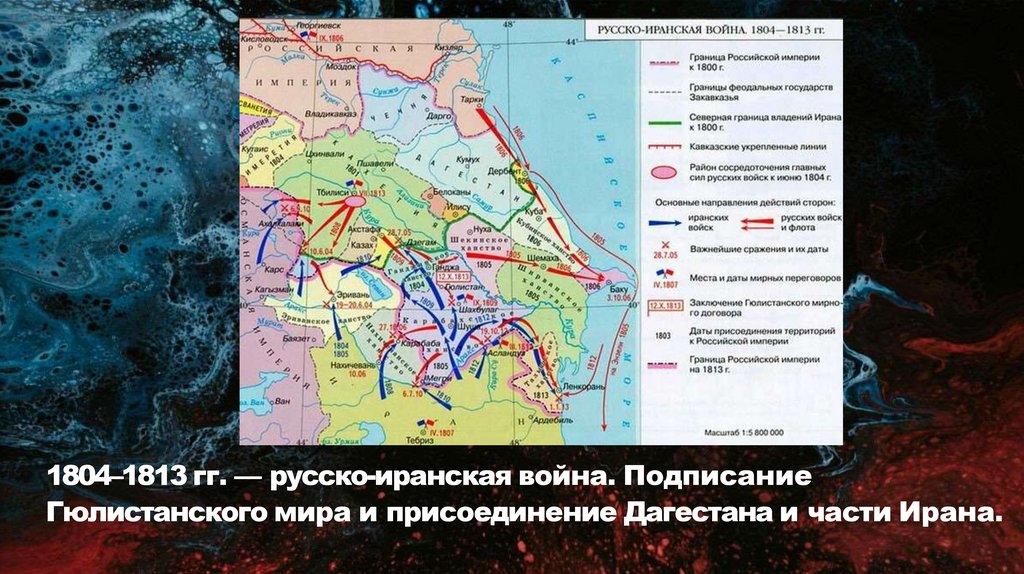 1804–1813 гг. — русско-иранская война. ПодписаниеГюлистанского мира и присоединение Дагестана и части Ирана.