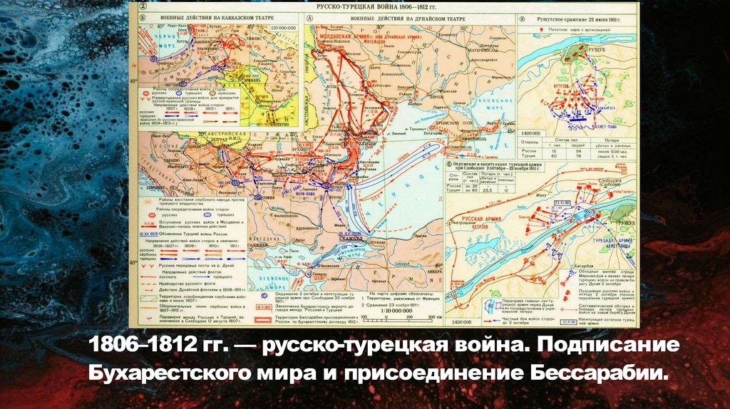 1806–1812 гг. — русско-турецкая война. ПодписаниеБухарестского мира и присоединение Бессарабии.