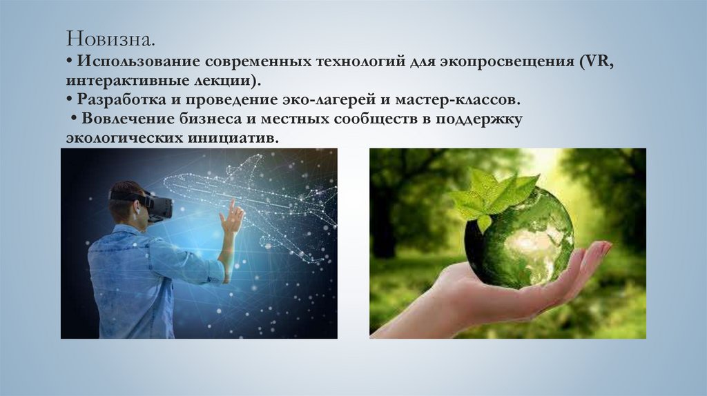 Новизна.• Использование современных технологий для экопросвещения (VR,