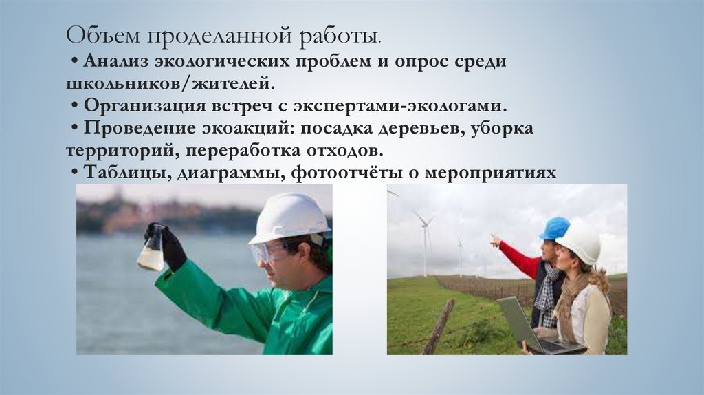 Объем проделанной работы.• Анализ экологических проблем и опрос среди
