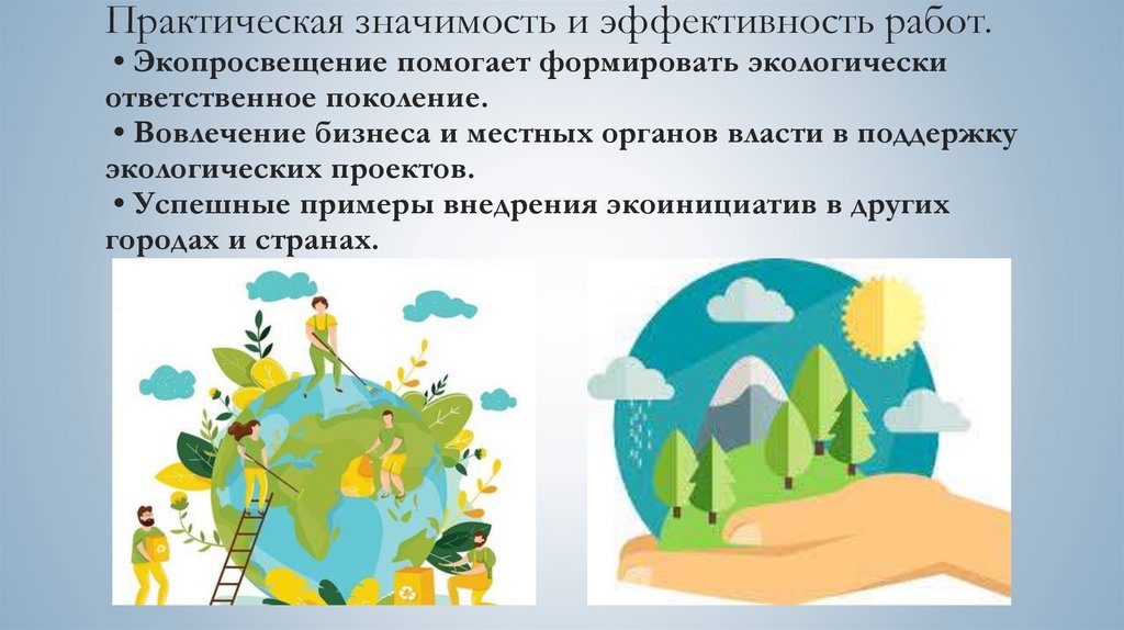 Практическая значимость и эффективность работ.• Экопросвещение помогает формировать экологически