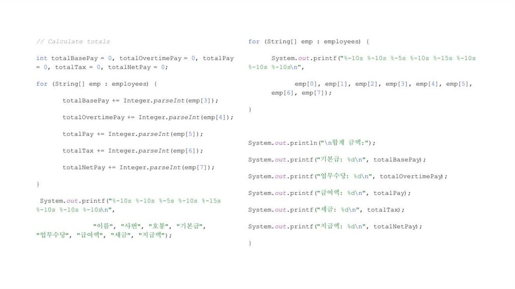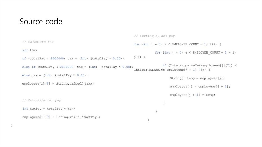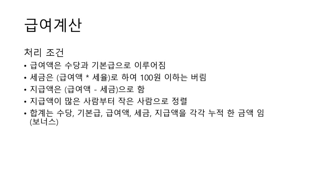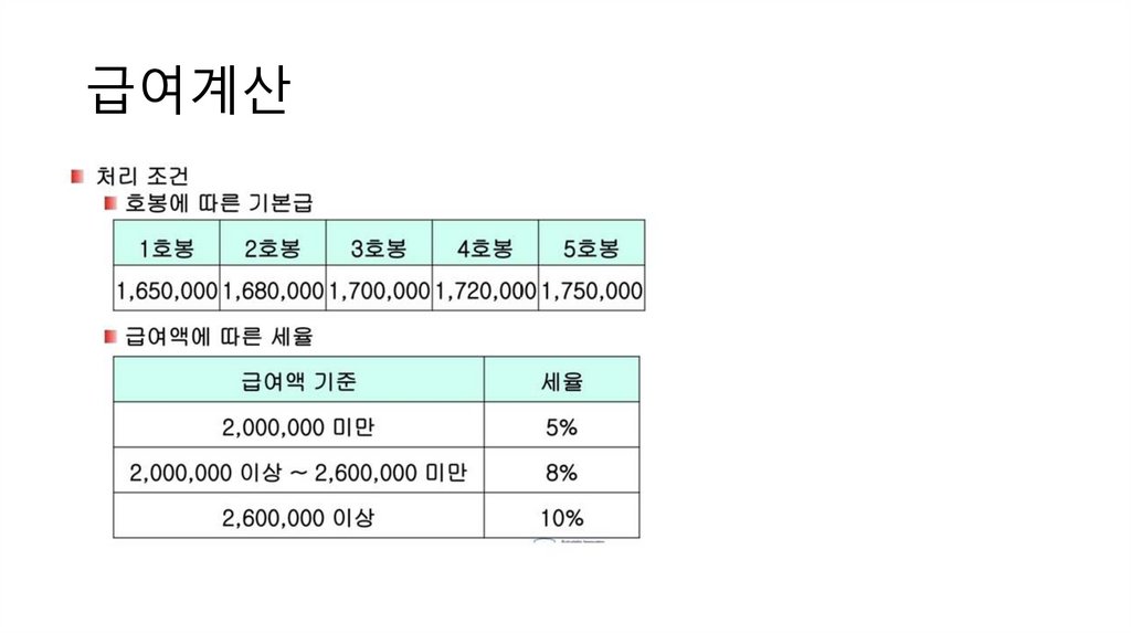 • 세금은 (급여액 * 세율)로 하여 100원 이하는 버림