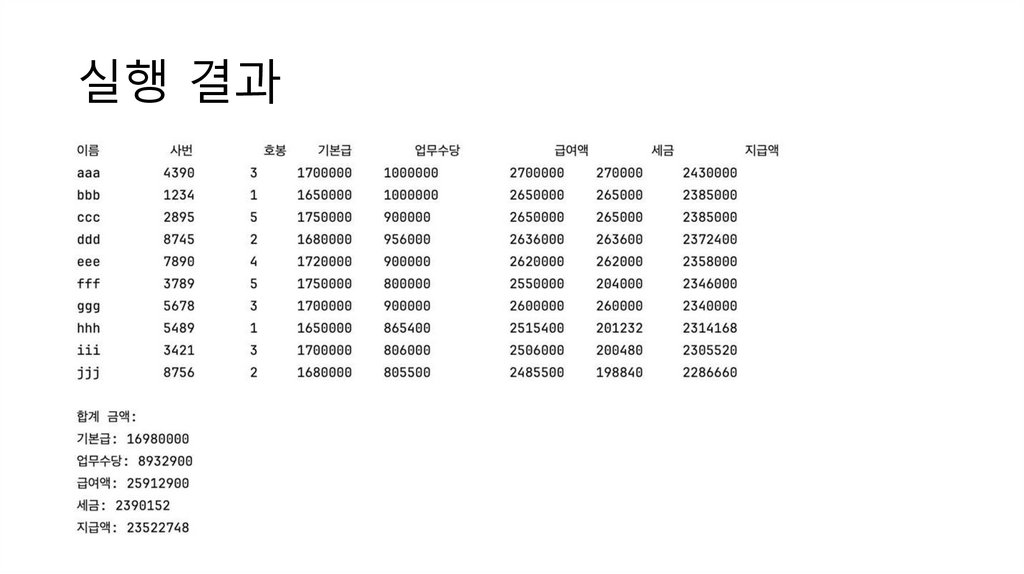 • 합계는 수당, 기본급, 급여액, 세금, 지급액을 각각 누적 한 금액 임