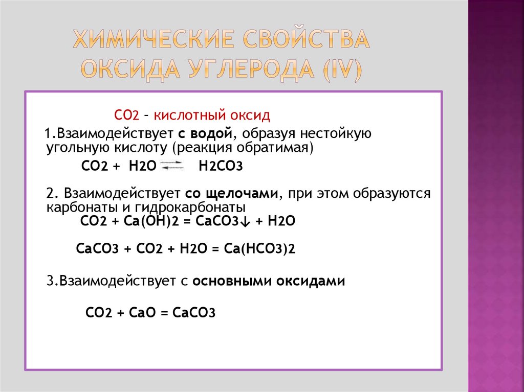 CO2 – кислотный оксид1.Взаимодействует с водой, образуя нестойкую