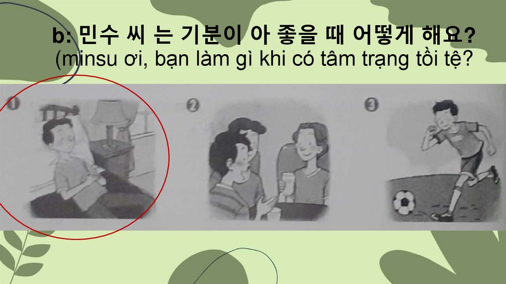 b: 민수 씨 는 기분이 아 좋을 때 어떻게 해요?(minsu ơi, bạn làm gì khi có tâm trạng tồi tệ?