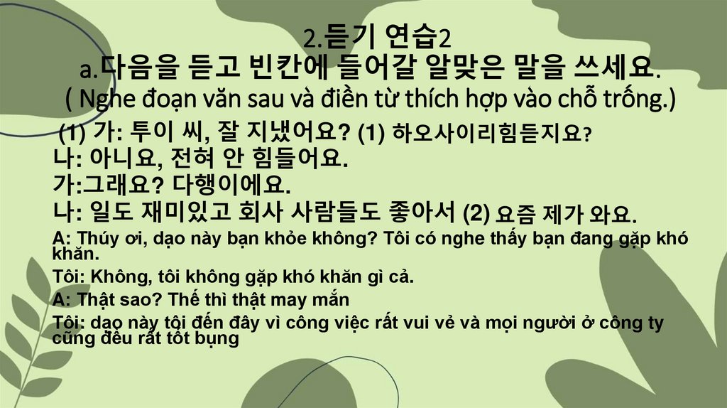 (1) 가: 투이 씨, 잘 지냈어요? (1) 하오사이리힘듣지요?