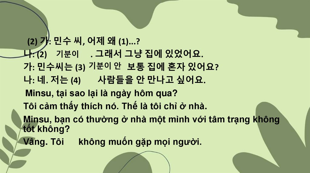 (2) 가: 민수 씨, 어제 왜 (1)...?나: (2) 기분이 . 그래서 그냥 집에 있었어요.