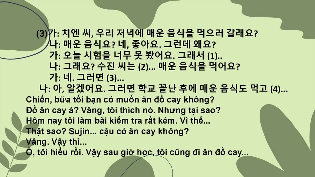 (3)가: 치엔 씨, 우리 저녁에 매운 음식을 먹으러 갈래요?나: 매운 음식요? 네, 좋아요. 그런데 왜요?