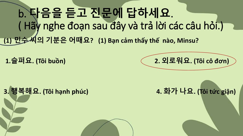 b. 다음을 듣고 진문에 답하세요.( Hãy nghe đoạn sau đây và trả lời các câu hỏi.)