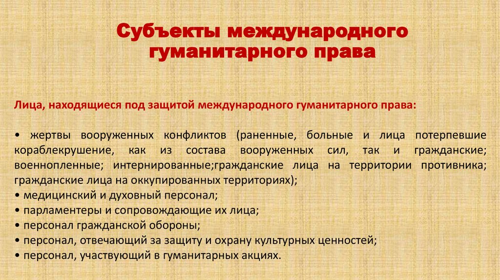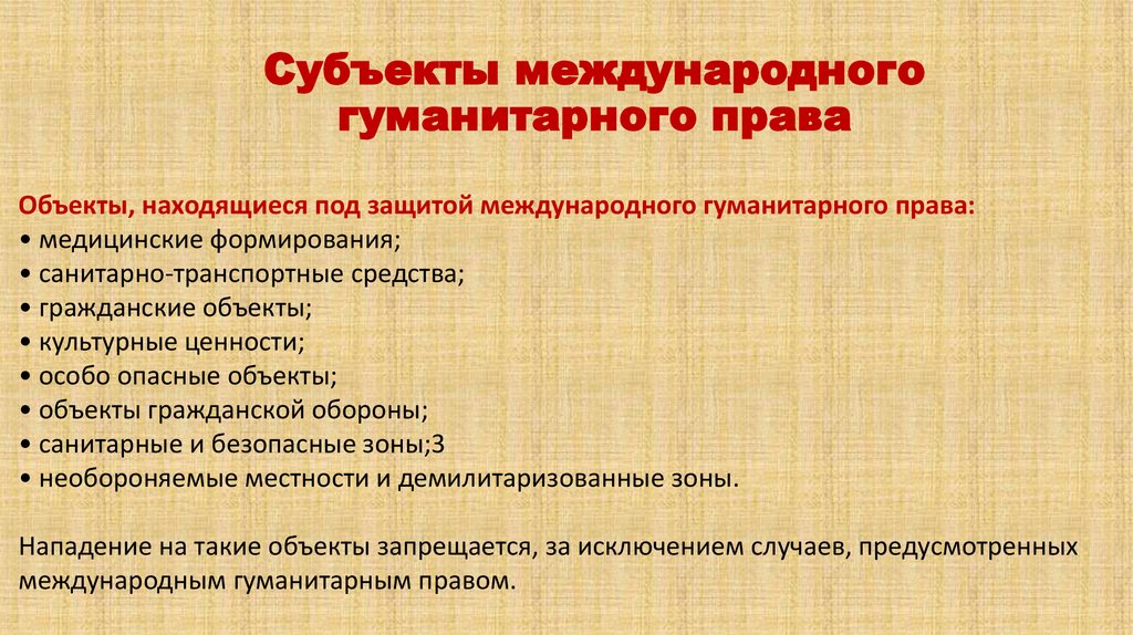 Объекты, находящиеся под защитой международного гуманитарного права: