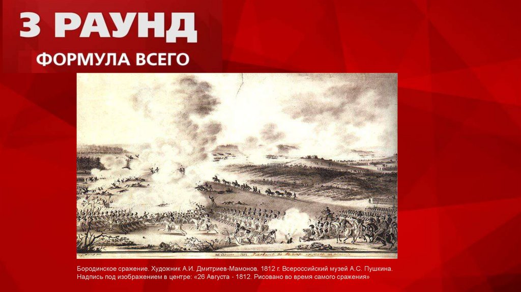 Бородинское сражение. Художник А.И. Дмитриев-Мамонов. 1812 г. Всероссийский музей А.С. Пушкина.