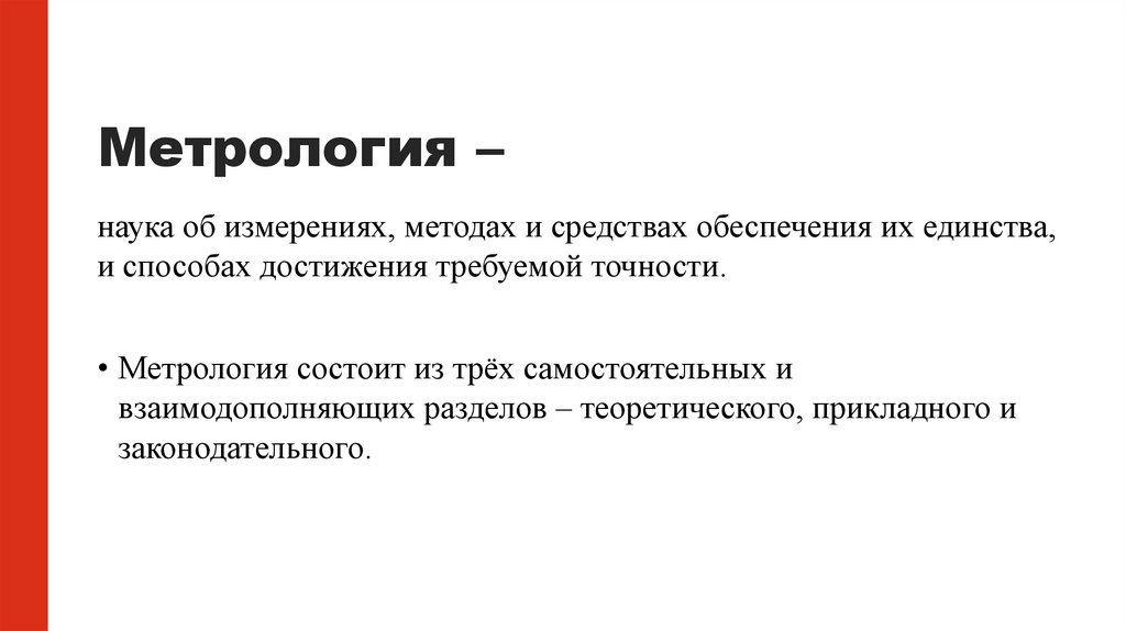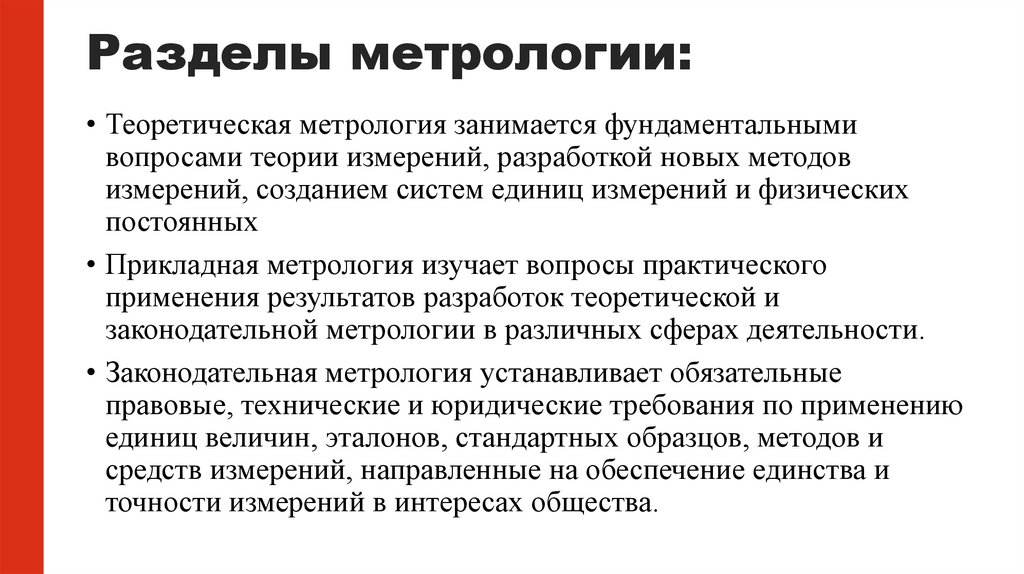 Разделы метрологии:• Теоретическая метрология занимается фундаментальными