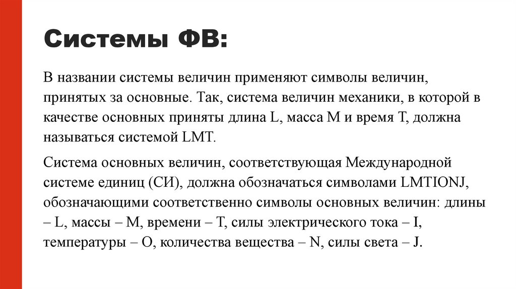 – L, массы – М, времени – Т, силы электрического тока – I,