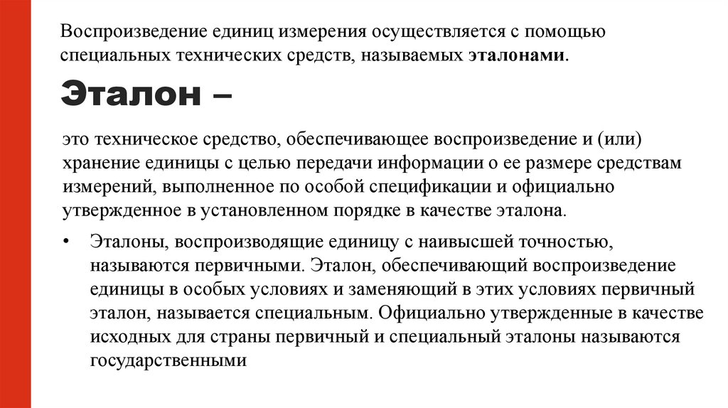 Воспроизведение единиц измерения осуществляется с помощьюспециальных технических средств, называемых эталонами.