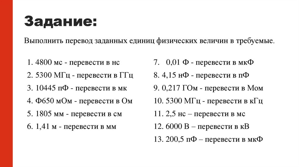 Задание:Выполнить перевод заданных единиц физических величин в требуемые.
