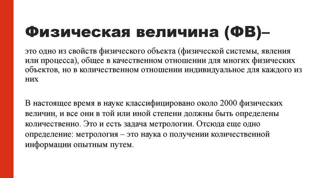 Физическая величина (ФВ)–это одно из свойств физического объекта (физической системы, явления