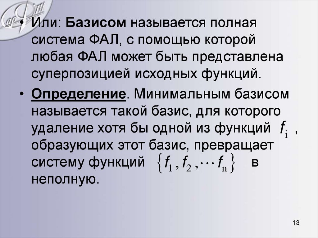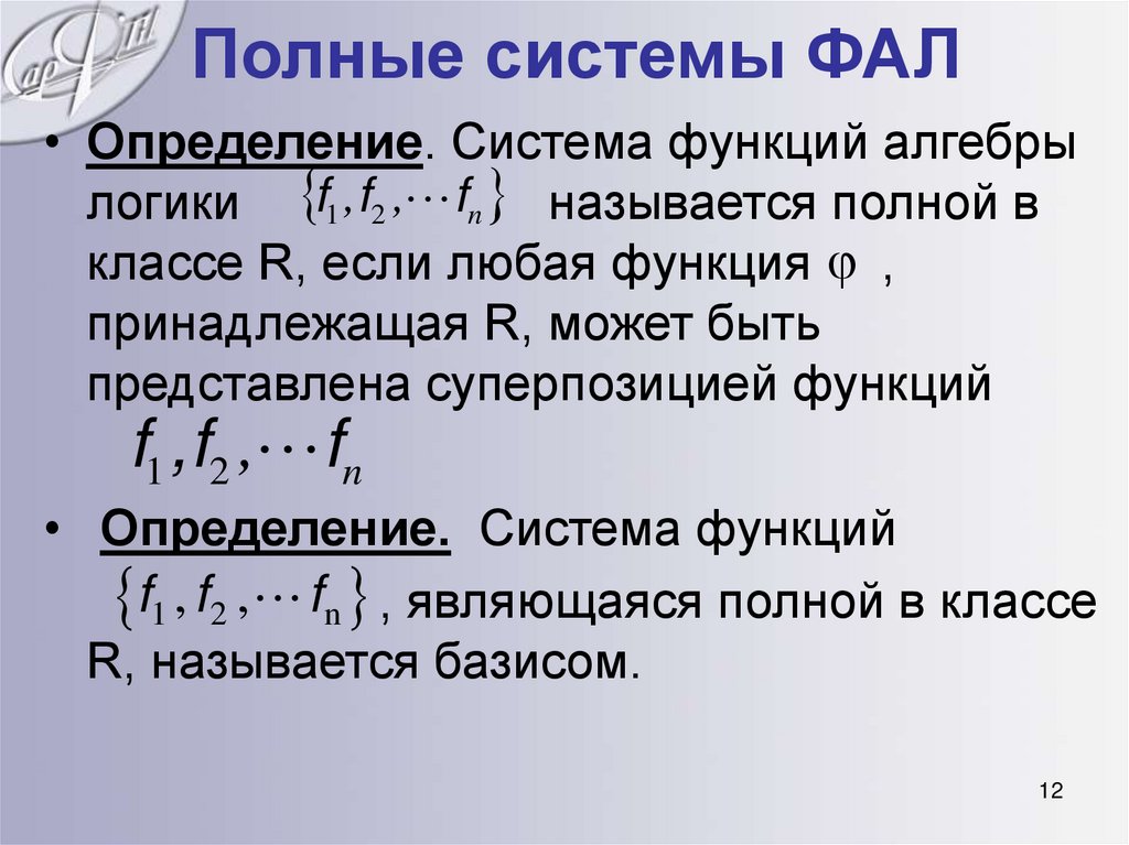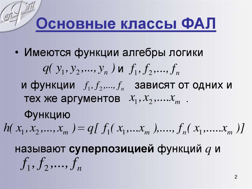• Имеются функции алгебры логикиq( y1 , y2 ,..., yn ) и f1 , f 2 ,..., f n