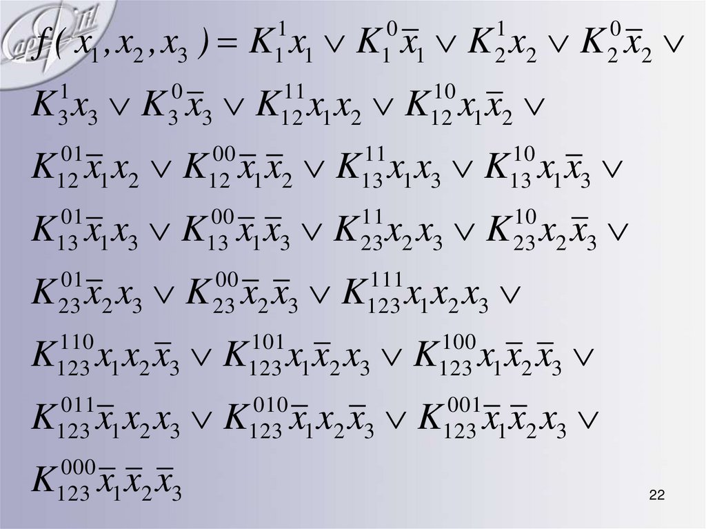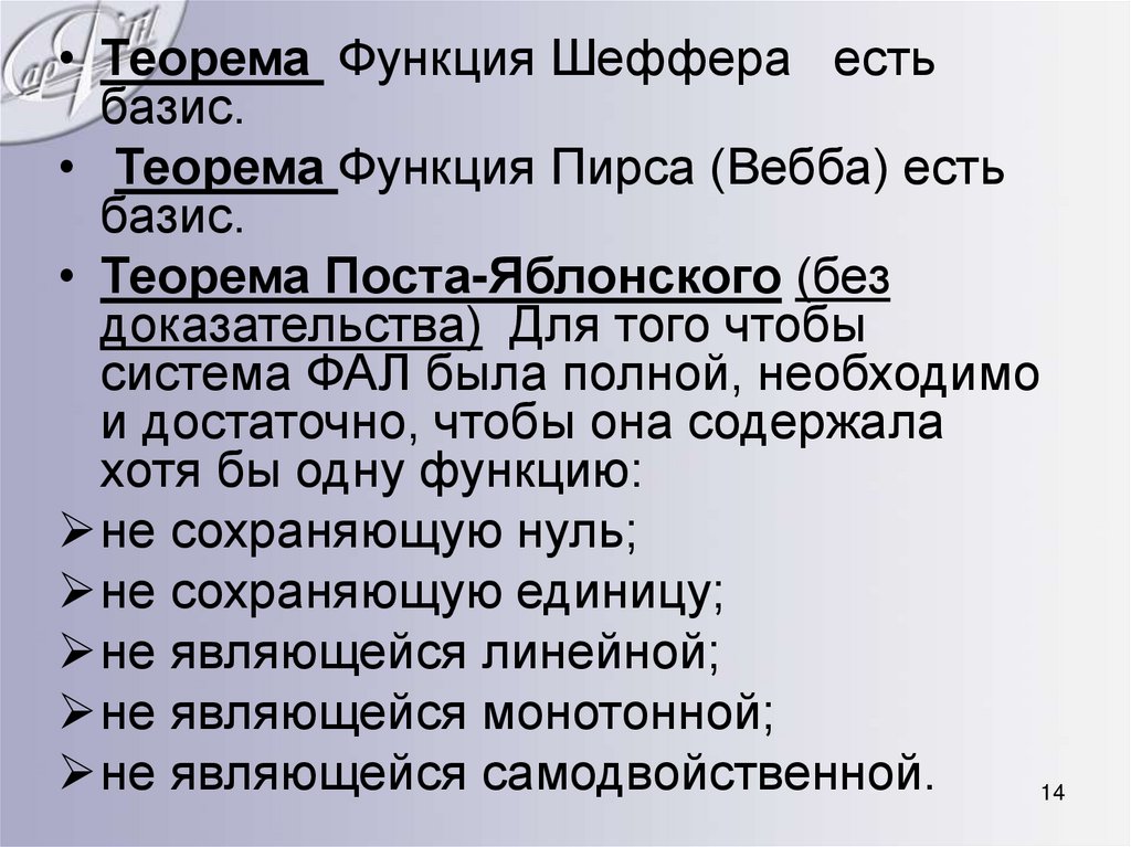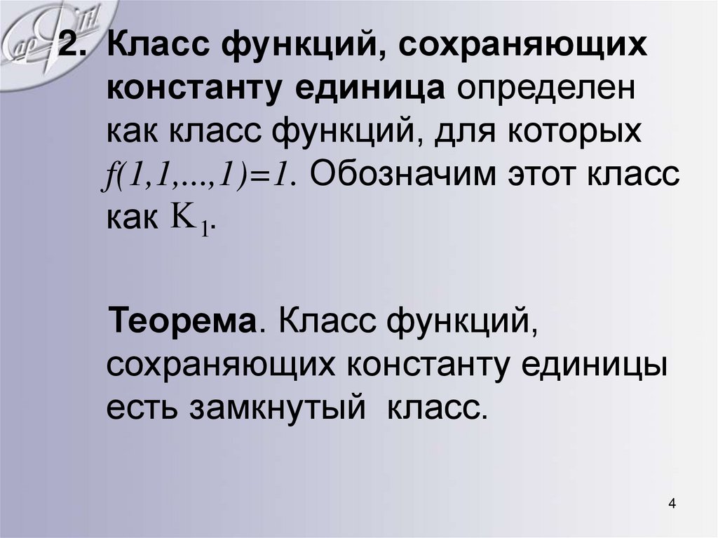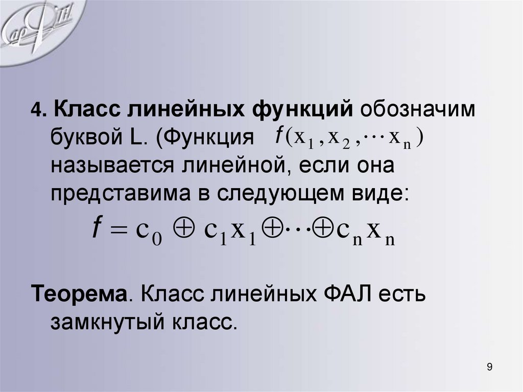 4. Класс линейных функций обозначимбуквой L. (Функция f ( x 1 , x 2 , x n )