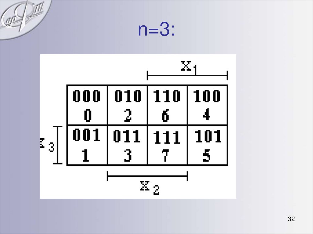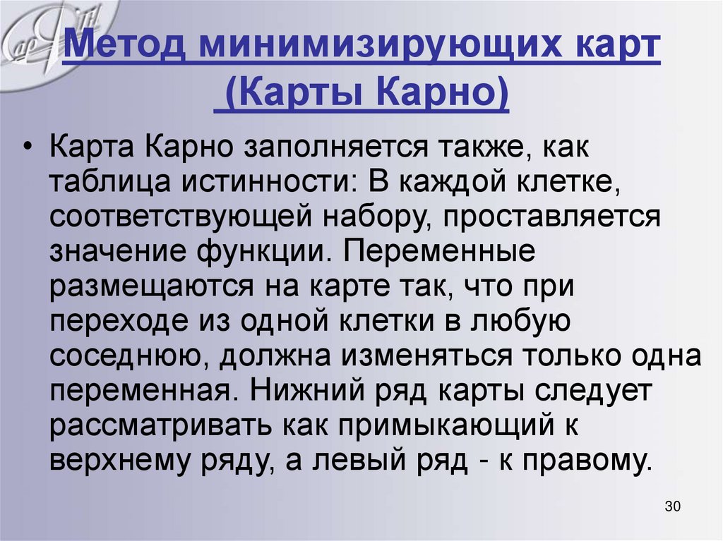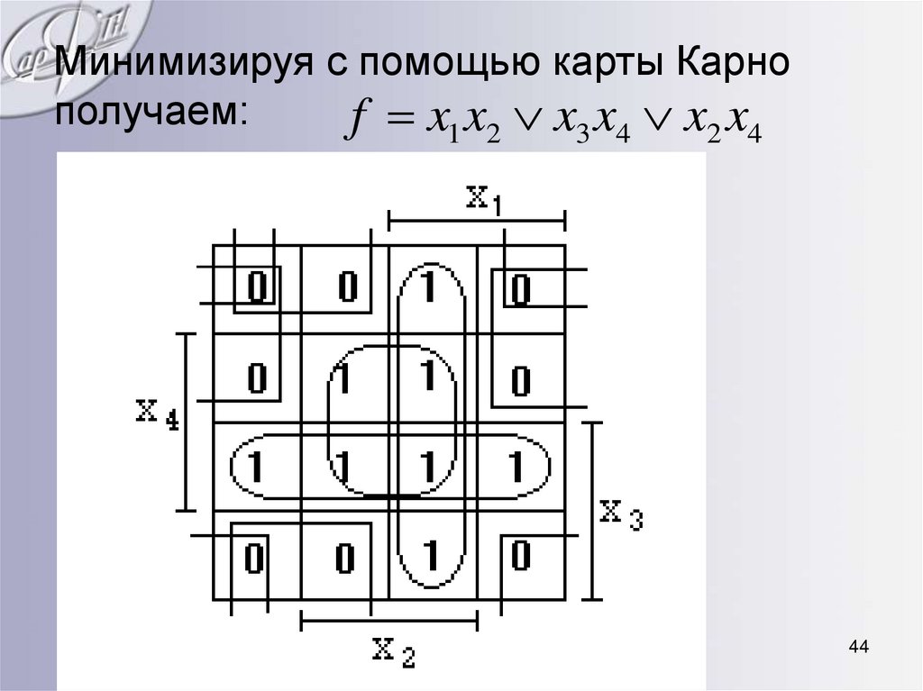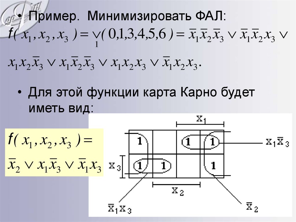 • Карта Карно заполняется также, кактаблица истинности: В каждой клетке,