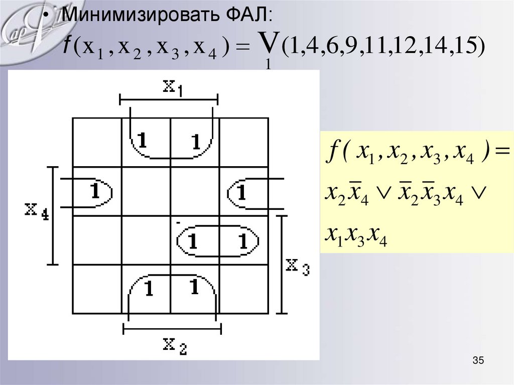• Минимизировать ФАЛ:f ( x 1 , x 2 , x 3 , x 4 ) V(1,4 ,6,9 ,11,12 ,14 ,15)