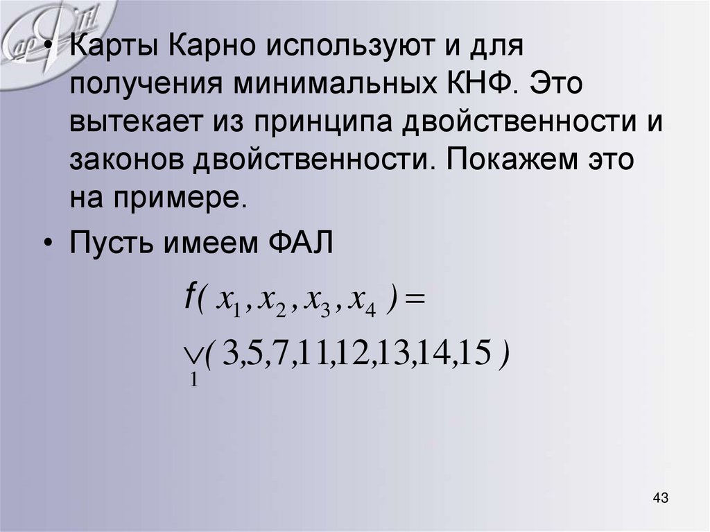 • Карты Карно используют и дляполучения минимальных КНФ. Это