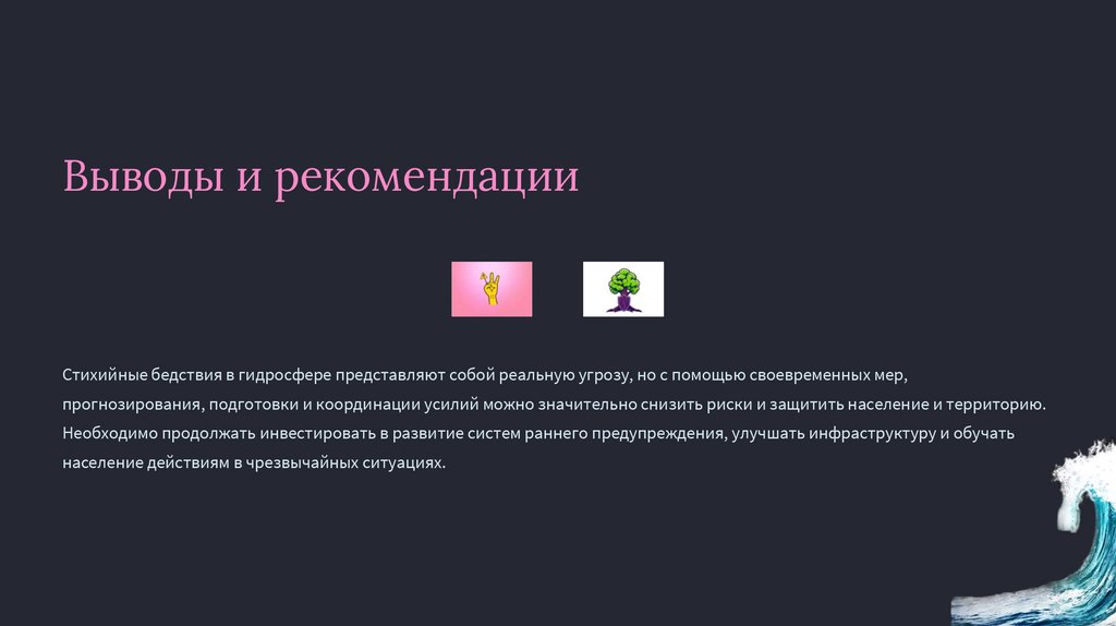 Выводы и рекомендацииСтихийные бедствия в гидросфере представляют собой реальную угрозу, но с помощью своевременных мер,