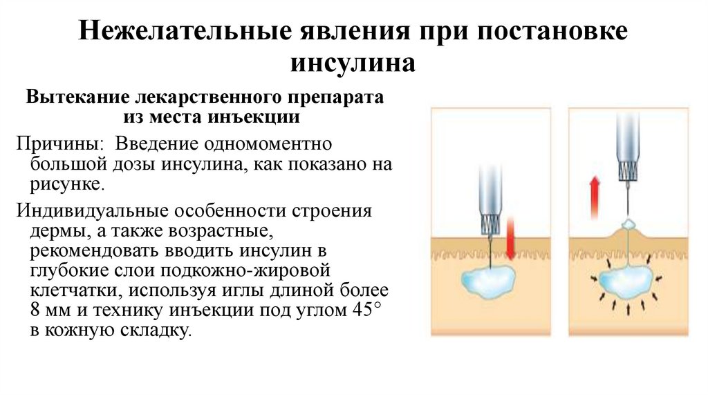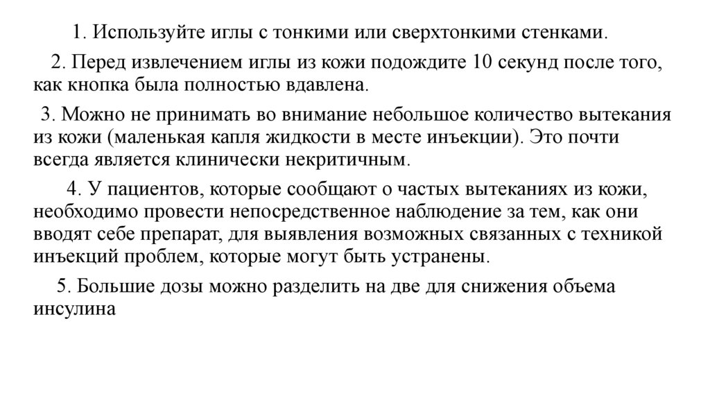 1. Используйте иглы с тонкими или сверхтонкими стенками.2. Перед извлечением иглы из кожи подождите 10 секунд после того,